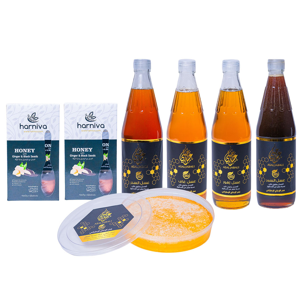 هذا العرض يحتوي على مجموعة مختارة من منتجات عسل جبلى الفريدة والفاخرة لتمنحك الكثير من الفوائد الصحية والطاقة والحيوية